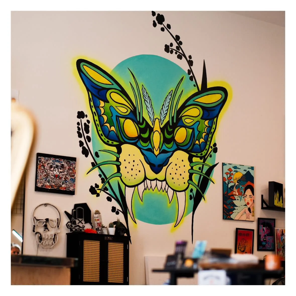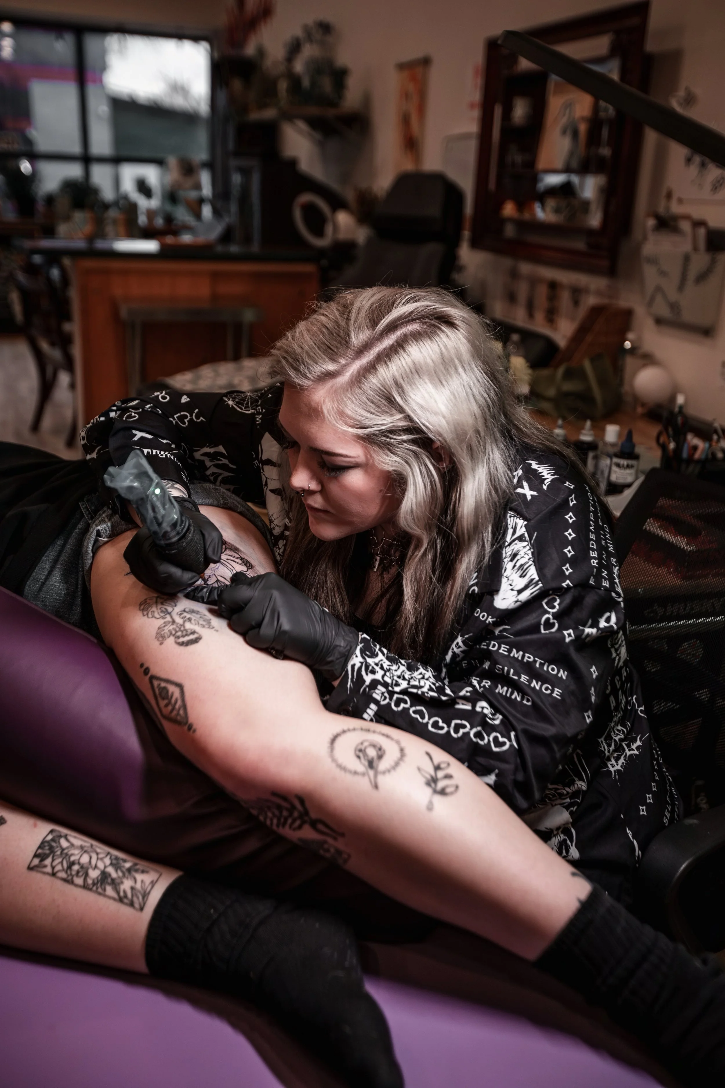Originally from California, I grew up enamored with skate and graffiti culture, surrounded by badass tattooed individuals who embodied unapologetic self-expression. I realized early on that this was the world I wanted to immerse myself in. The allure of their ink and the artistry in the murals spoke to my soul, igniting a burning desire to create and contribute to this culture in a pretty big way. Now, as a Kansas City-based tattoo artist and muralist, I’m chasing those dreams, infusing my work with a dark, bold style and a twist of trippy retro aesthetic, all while staying true to the rebellious roots that fired up my passion.It’s not just about tattoos; it’s about crafting stories on skin and creating a one of a kind experience that my clients get to carry with them for the rest of their lives.